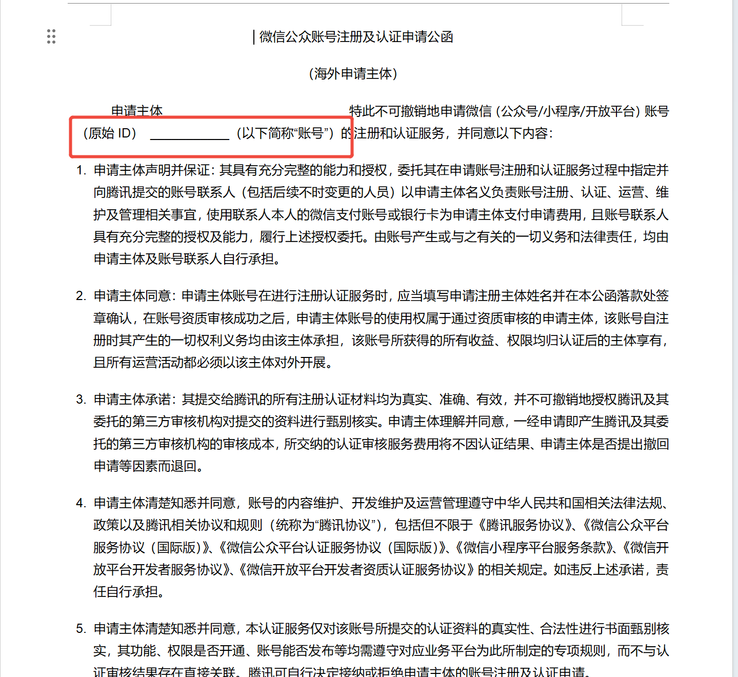 新注册公众号企业服务号,用香港公司做主体,在认证过程中需提交微信公众账号注册及认证申请公函,公函里需填写原始ID,只是注册还没认证就有原始ID了吗?在哪里可以找到原始ID,还没认证的情况下。
