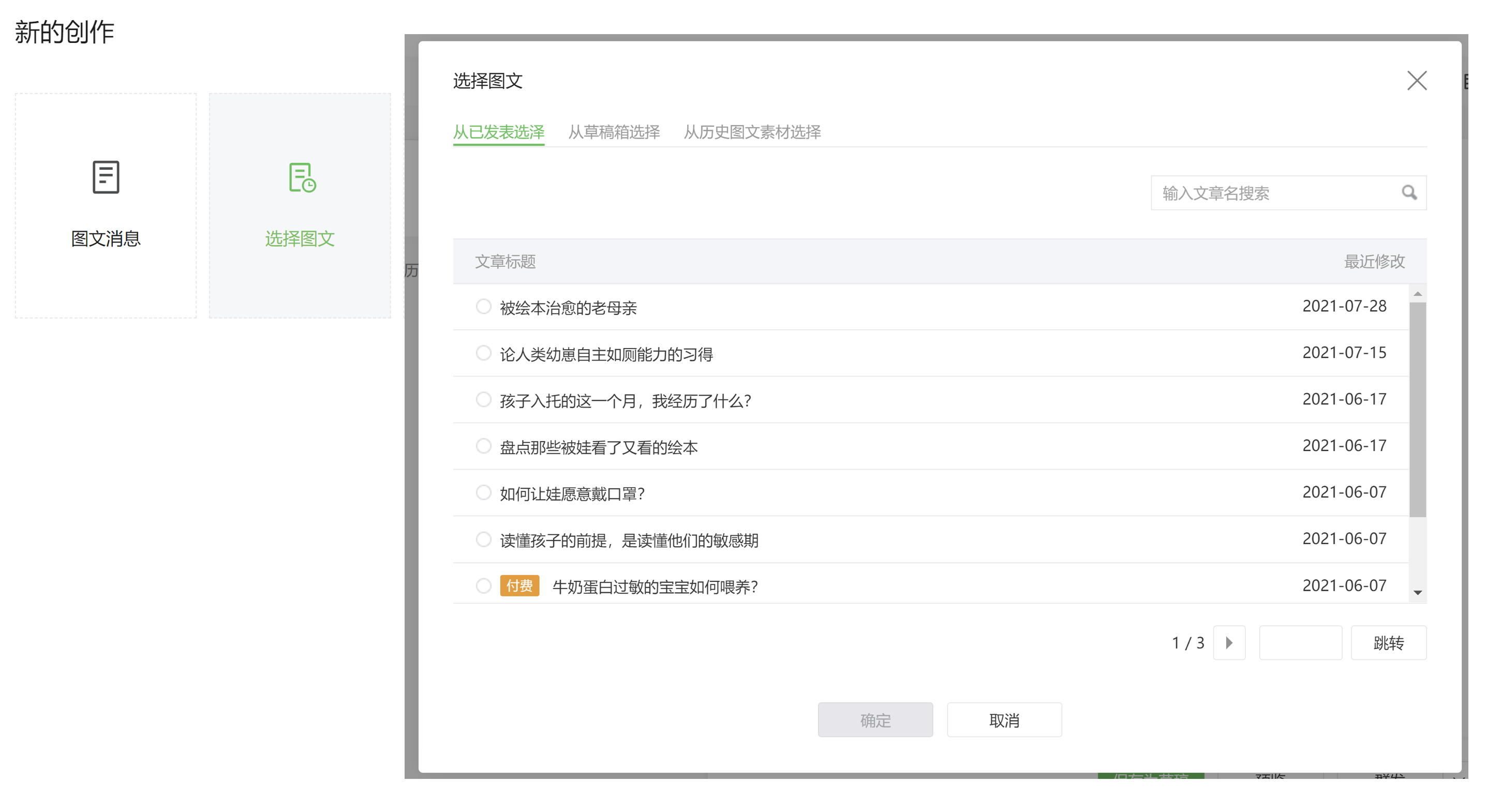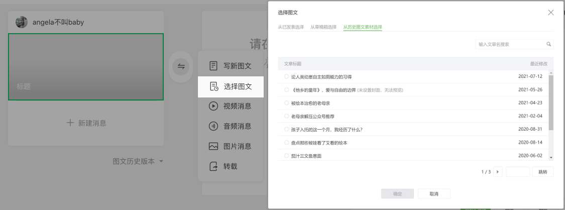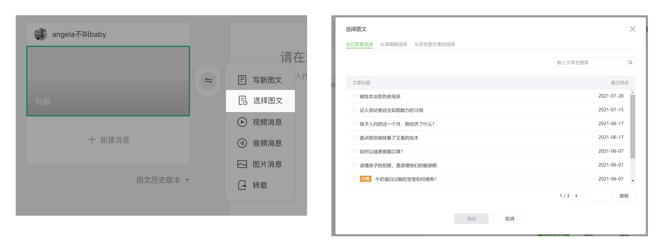 2、通过选择图文入口导入历史素材:首页和编辑器提供了选择图文功能,使用该功能可导入历史素材进行编辑和发表。
