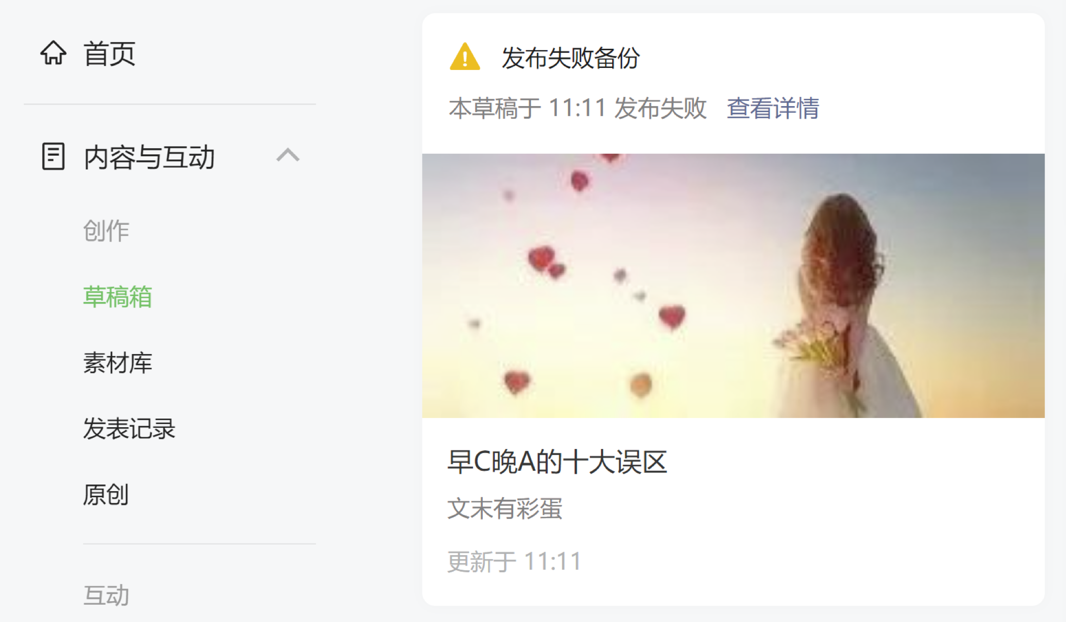 若在发表过程中出现系统失败,草稿箱中会保留这份草稿的备份。