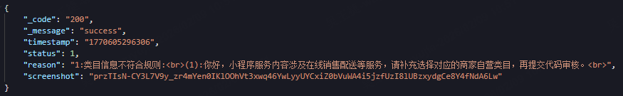 小程序服务内容涉及在线销售配送等服务,请补充选择对应的商家自营类目,再提交代码审核。