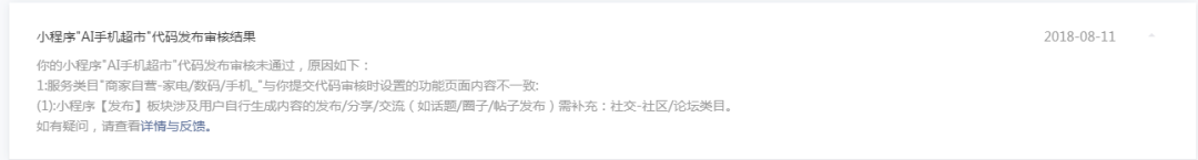 你好,经核实,小程序存在【发布】页面,且该页面内容涉及用户自行生成内容的发布/分享/交流,请自查、处理相关违规内容,确保包括前端展示、小程序代码等整体均没有违规内容。请将相关前端展示、相关代码等均完整去除后,再提交代码审核。