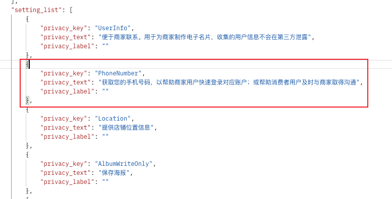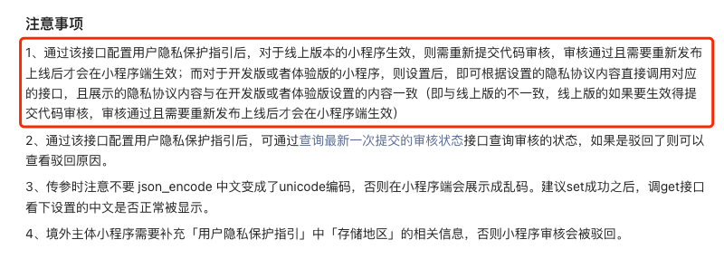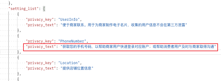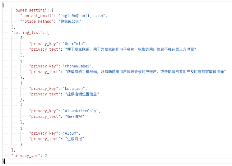 然后调用接口 https://api.weixin.qq.com/cgi-bin/component/getprivacysetting 获取隐私协议,显示内容与预期一致