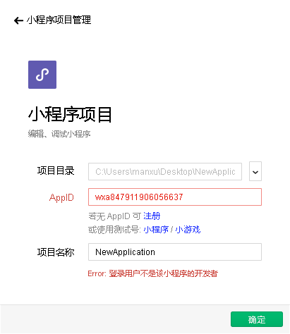 新建小程序或小游戏时测试号不能正常使用,显示错误“登陆用户不是该小程序的开发者”。检查测试号申请情况。一切正常。