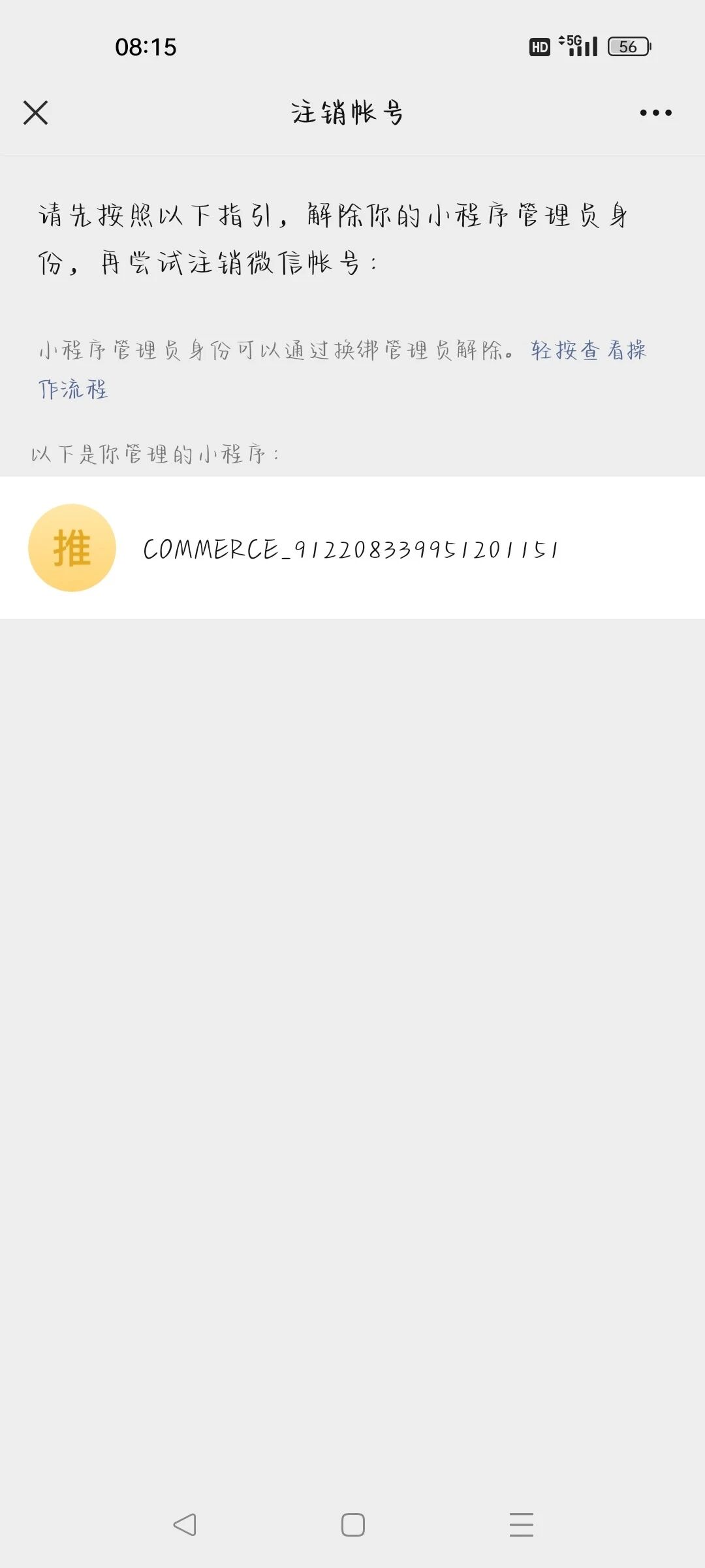 注销微信号Minemine9615提示有小程序COMMERCE_912208339951201151,如何解绑