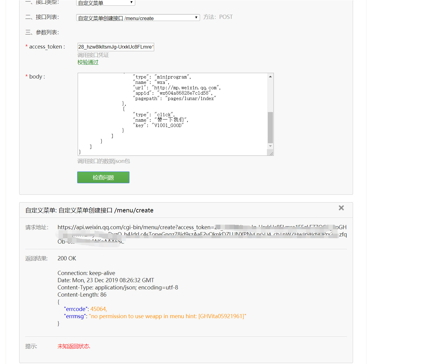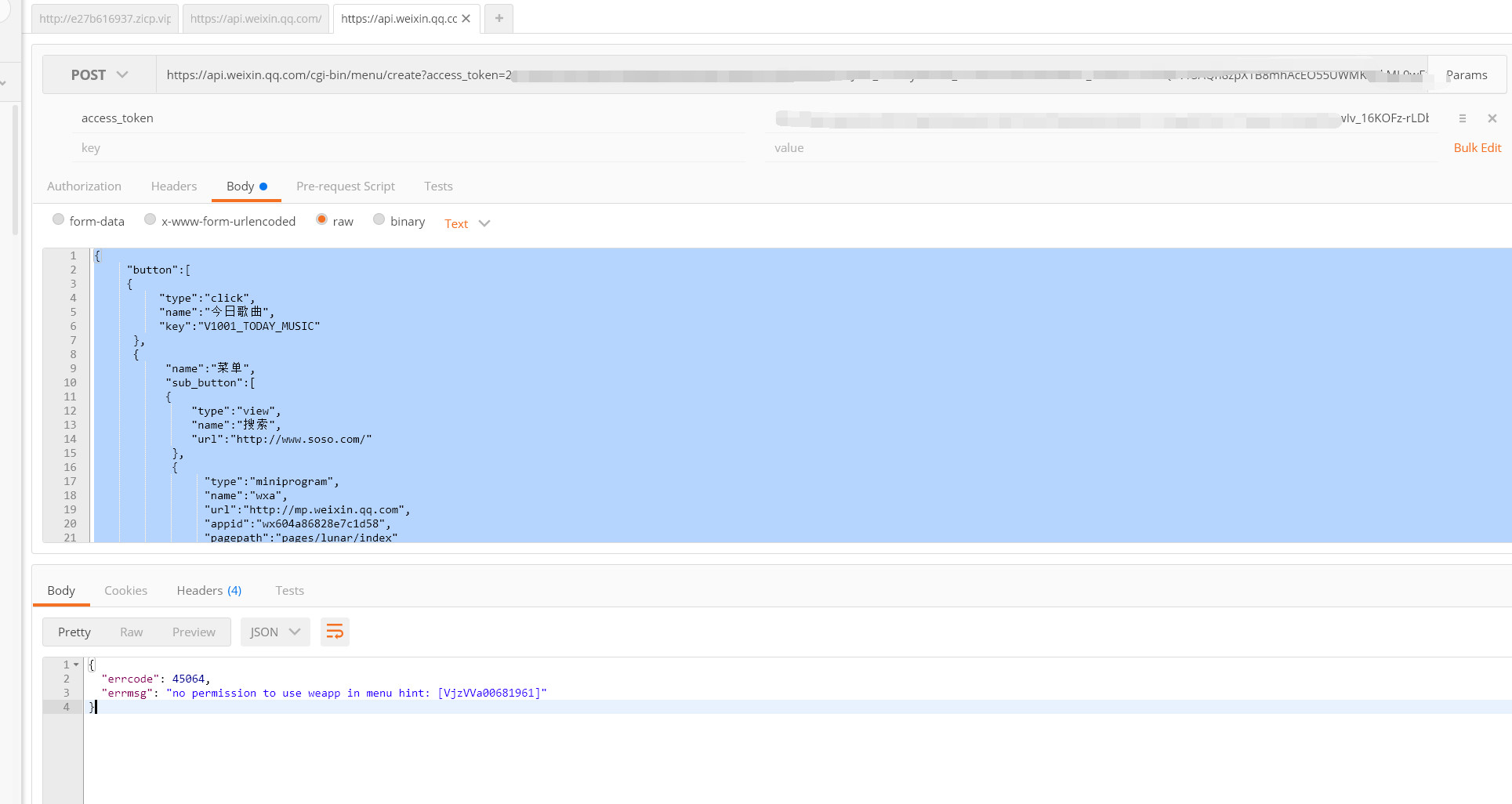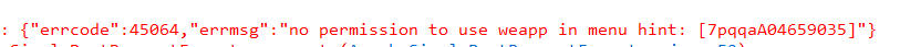 {"errcode":45064,"errmsg":"no permission to use weapp in menu hint: [7jcXWa0860vr20]"}