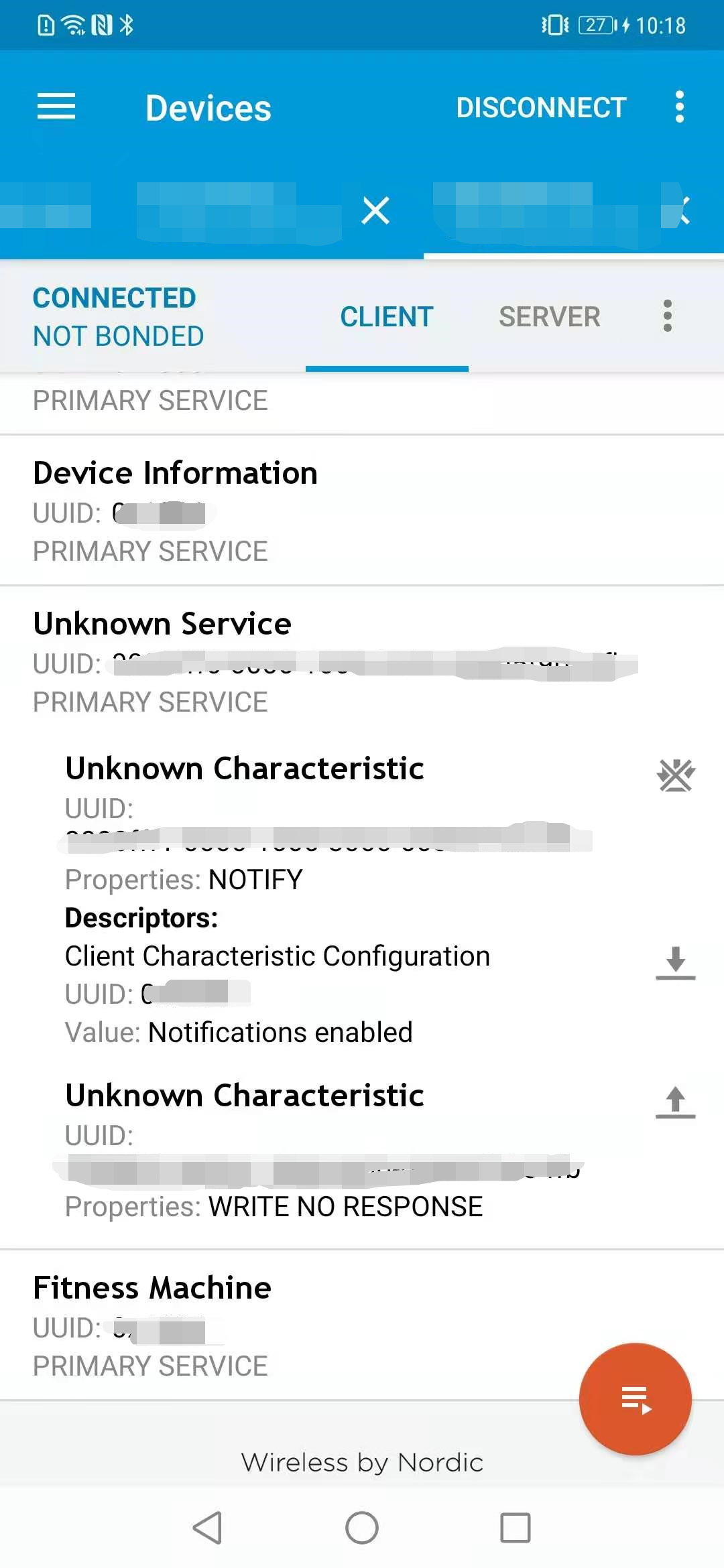 3、于是打开另一个软件nRF Connect 连接上这台设备,并在这里监听特征值变化