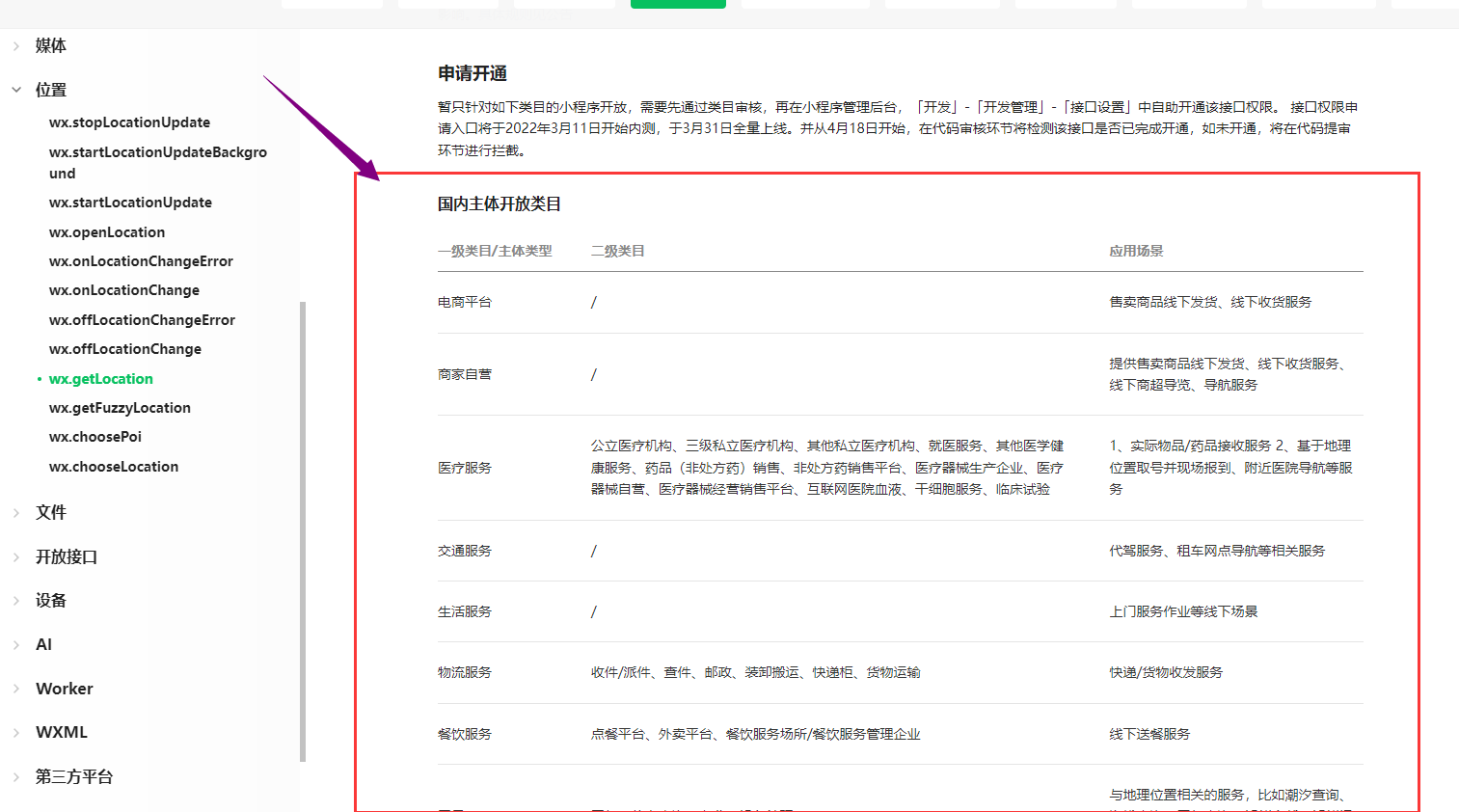 你的小程序要添加以下服务类目之一,才有权限去申请开通定位权限,参考文档:https://developers.weixin.qq.com/miniprogram/dev/api/location/wx.getLocation.html