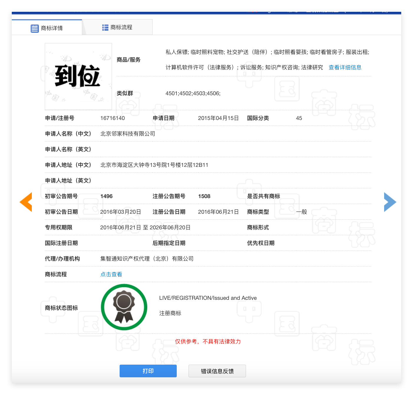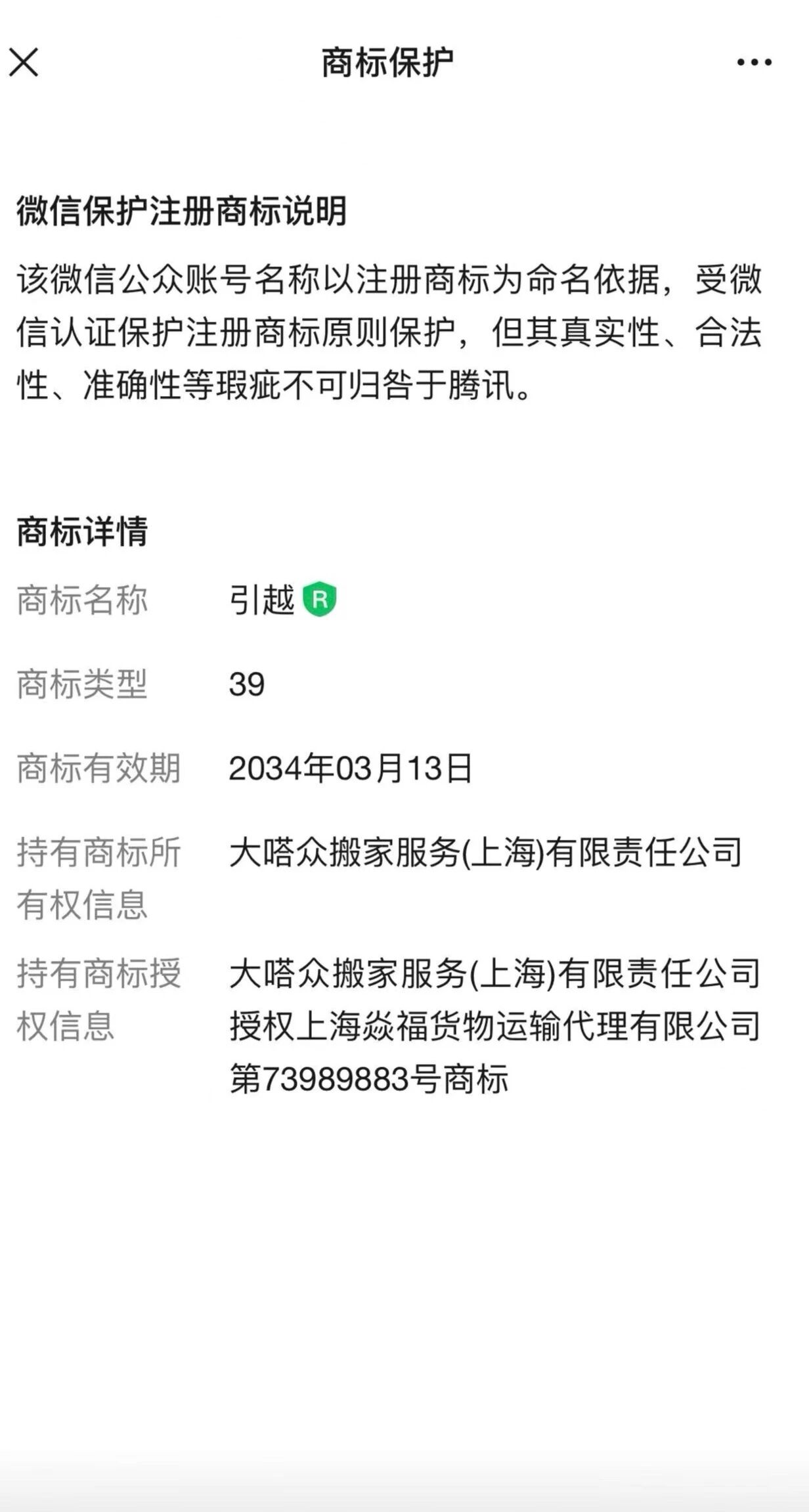 异常内容:认证账号商标的使用范围是 39 类,根据中国商标局查询结果,核定使用范围内容是:物流运输(3901)、拖运(3902)、运载工具故障牵引服务(3902)、河运(3902)、汽车运输(3903)、陆路运输(3903)、搬家货车运输(3903)、公共汽车运输(3903)、仓储服务(3906)、货物储存(3906),