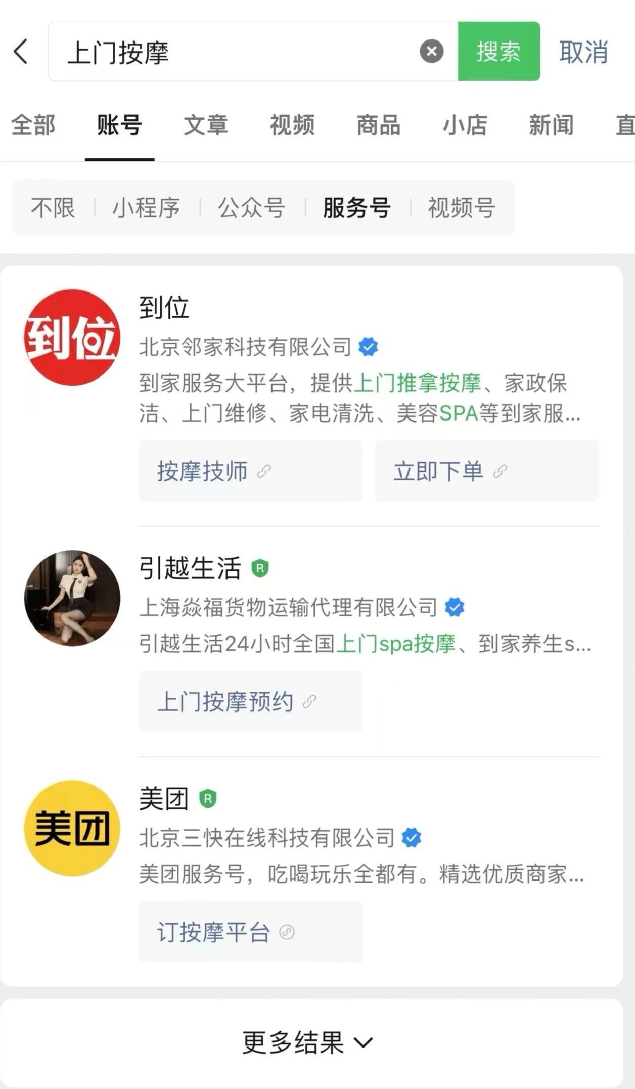 工商经营范围没有任何关于按摩的类目,但账号内容是提供上门按摩服务,请问腾讯官方,这种账号是怎么通过审核的,为什么反馈多次仍然不予处理,并且官方还给这种账号服务内容的核心关键词,服务号排名第二的流量扶持,是有内幕还是 BUG???