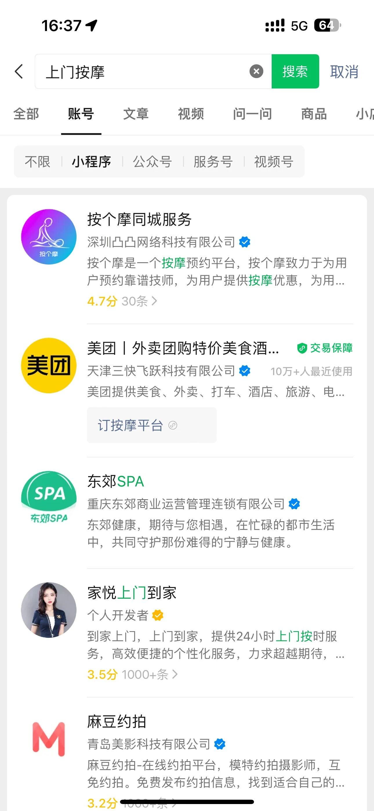 异常内容:你们腾讯官方说的清清楚楚,小程序不支持上门按摩,但这个小程序在小程序排名第一,小程序 banner 明确引导公众号提供上门按摩服务,小程序通过多层嵌套展示上门按摩服务(必须登录才可以展示),并且在该小程序隐私里面明确也说明了提供上门按摩服务,但腾讯不仅未处理,反倒给于排名第一的流量扶持,是有内幕还是 BUG???
