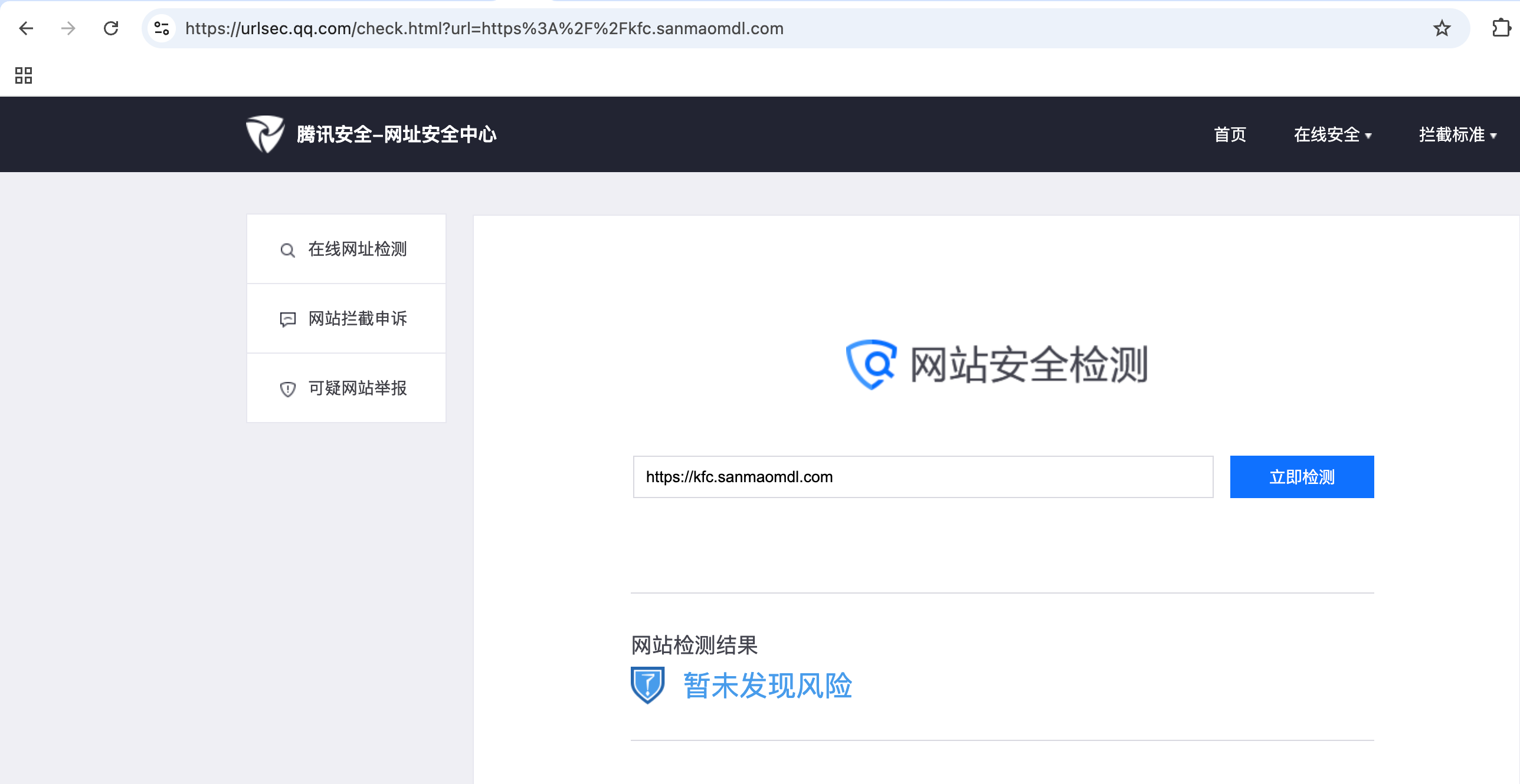 https://kfc.sanmaomdl.com/,域名并未违规,但是在微信内无法直接访问,需要能恢复直接访问