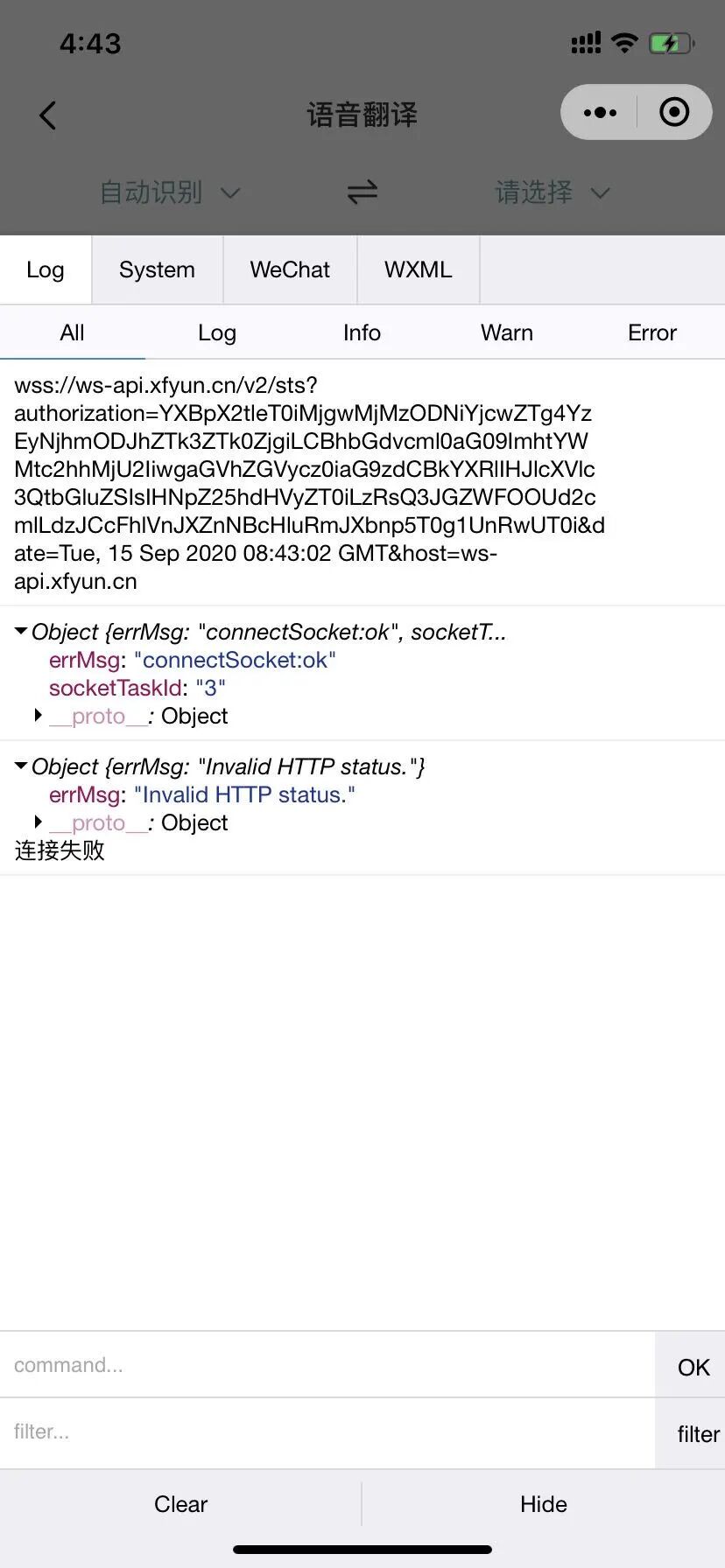 手机型号为iphoneXR版本号如图二,图一为编辑器请求是可以链接到,图三为真机,第一条打印为 socket路径