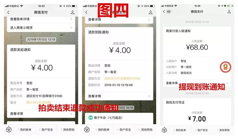 以上提到的几个封禁理由在产品中并未存在,拍卖时间、退款、提现都是正常的,图三和图四是小程序还未被封禁前退款、提现正常的截图,但是想再次申诉找不到入口了