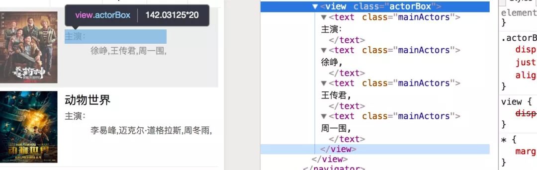 如图,写死了第一个text:主演,然后后面都是循环添加的text,没加样式,但是却自动换行了、可以看到高亮的父元素的宽度是正常的包括所有的text的宽度。