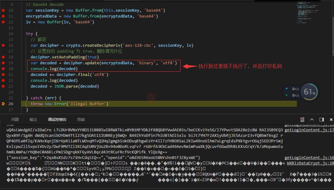 导致问题的原因是getUserInfo放在了wx.login之前。getUserInfo获取到 iv 和encryptedData 传给后台。 wx.login调用时用户的 session_key 可能会被更新而致使旧 session_key 失效。这样后台再去解密的时候就等于在用新的session_key去解密旧的session_key加密的数据,就会报上边的错误。