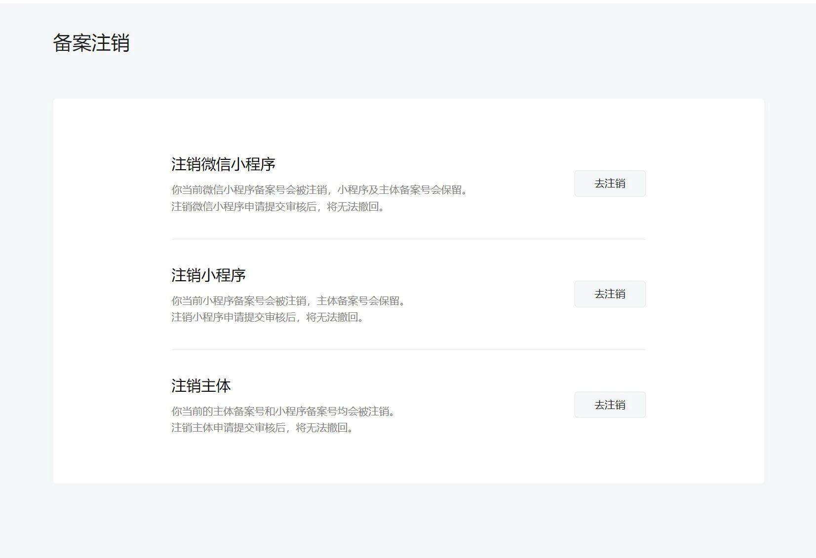 因注销是不可逆转的操作,建议开发者自行确认注销需求,避免造成不必要的损失,注销区别请参考:https://developers.weixin.qq.com/miniprogram/product/record/record_faq.html#%E5%8D%81%E5%9B%9B%E3%80%81%E6%B3%A8%E9%94%80%E5%A4%87%E6%A1%88%E7%9B%B8%E5%85%B3