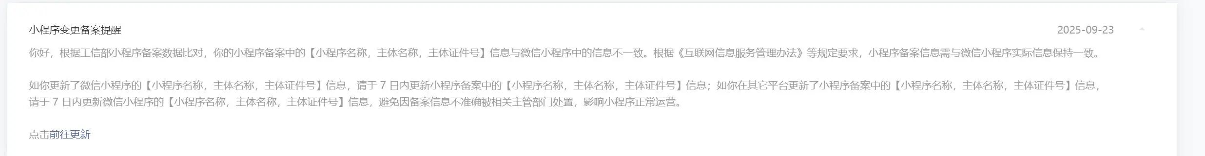 因主体变更需注销备案的,当前暂不影响小程序使用,注销后请尽快使用新主体重新发起备案,后续请开发者持续关注平台的公告、通知、站内信及模板消息等渠道。