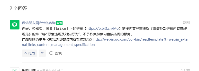 我的域名是 https://b.br3.cn,近期,用户反馈在微信内打开该域名链接时,出现“如需浏览,请长按网址复制后使用浏览器”提示,严重影响了用户体验和网站的正常访问。经过我本人全面自查: