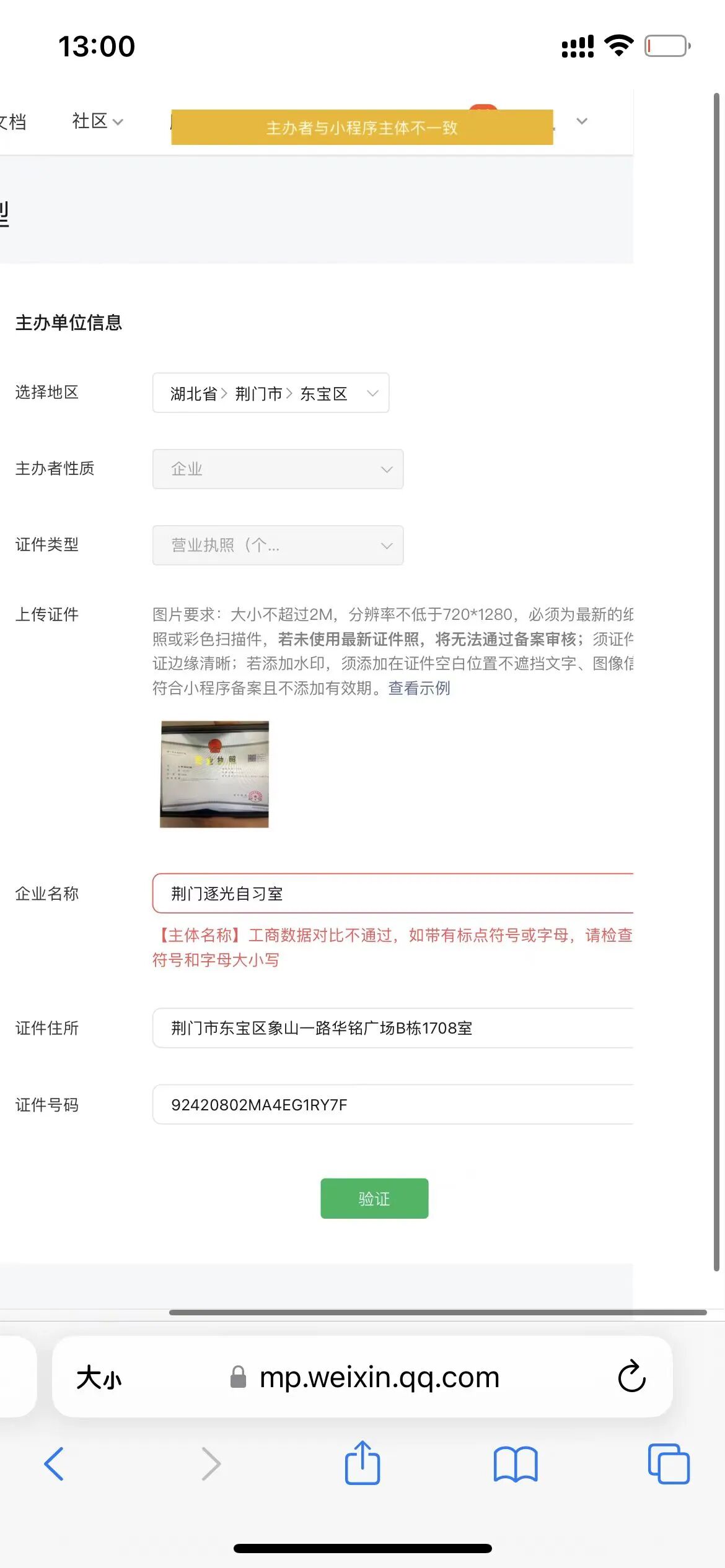 营业执照注册的时候,还没有自习室的分类,所以名称为空白,现在小程序备案,企业名称试过我小程序的名字“荆门逐光自习室”试过经营者的名字,但都显示主办者与小程序主体不一致,该怎么办呢?