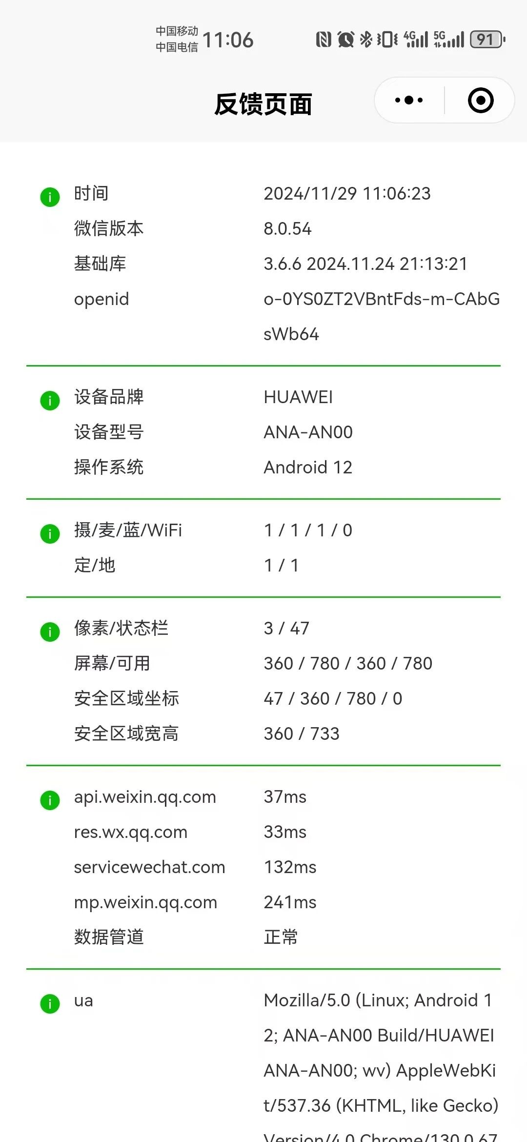 我这边的测试机器为:Android14、微信 8.0.54、基础库 3.6.6 (2024.11.24 21:13:21)
