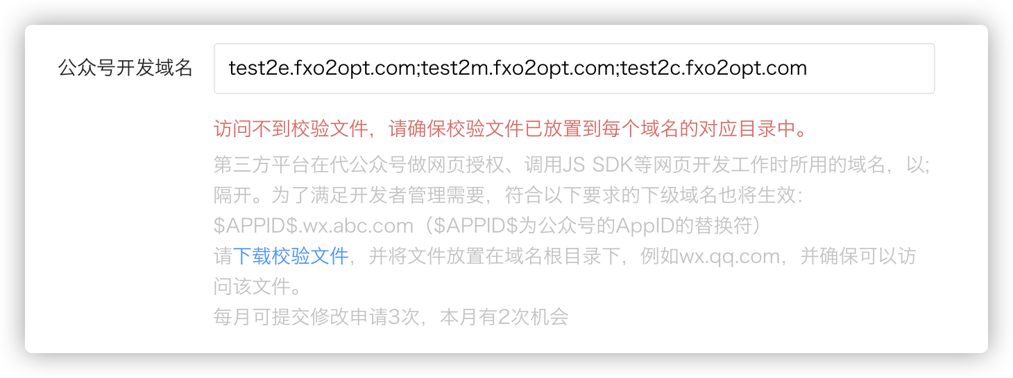 因业务需求增加公众号开发域名,原有域名:test2c.fxo2opt.com、test2m.fxo2opt.com,新增域名:test2e.fxo2opt.com,服务根目录放置校验文件后,一直提示访问不到校验文件,尝试去掉 test2e 域名,可以保存成功,请问是什么原因导致?