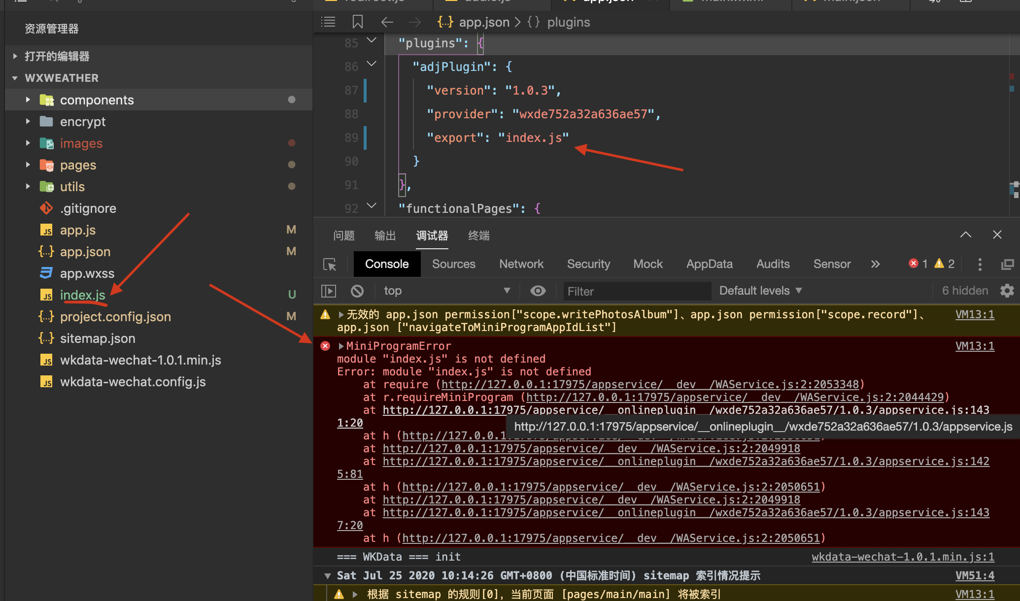 如上图所示,plugins中配置的export文件index.js,已经存在,但是编译的时候报错没有找到