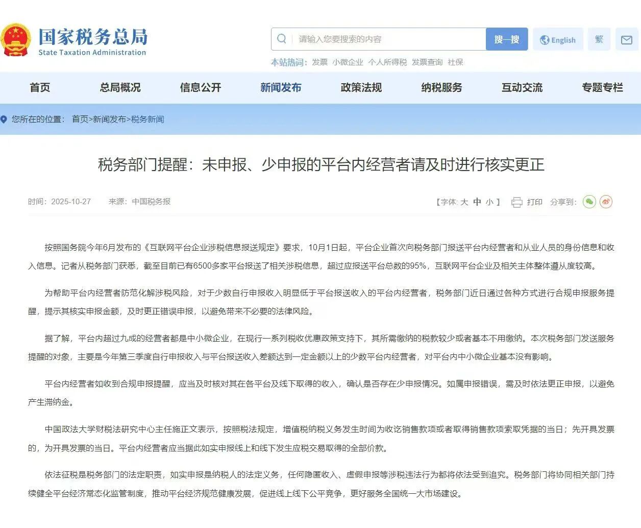 根据国家税务总局发布的《互联网平台企业涉税信息报送规定》,所有为电商、微信商户等平台提供营利性服务的主体均需按季度报送经营者的涉税信息。