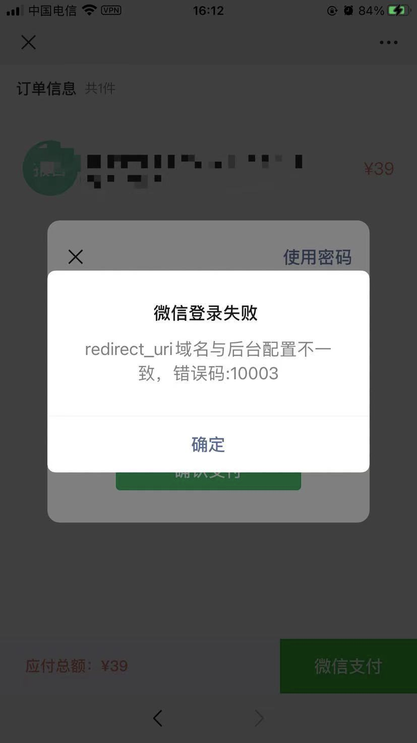 如题,JSAPI支付,统一下单成功,但是一直弹:redirect_url域名与后台配置不一致,错误码:10003,点掉报错后可以继续支付。