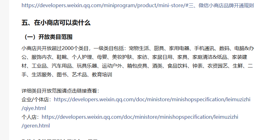 https://developers.weixin.qq.com/miniprogram/product/mini-store/#%E4%B8%80%E3%80%81%E5%BE%AE%E4%BF%A1%E5%B0%8F%E5%95%86%E5%BA%97%E5%BC%80%E6%94%BE%E7%B1%BB%E7%9B%AE%E4%B8%8E%E8%B5%84%E8%B4%A8%E8%A6%81%E6%B1%82
