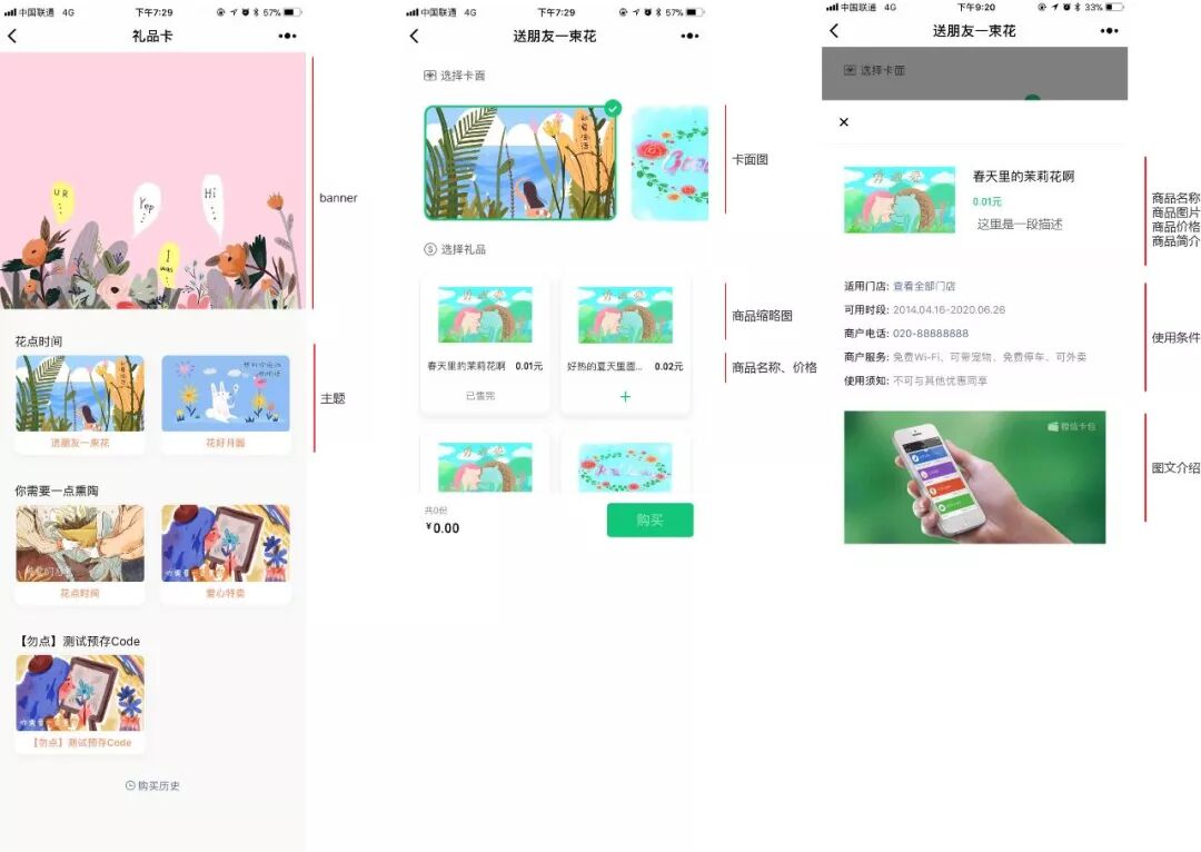 不用自己写前段页面,这些图片都是通过调用微信的接口上传的,创建货架后选礼品卡购买礼品卡这一套流程就自动有了。创建货架后调用接口就可以上传礼品卡的代码了。你可以看看我那个链接的第八点