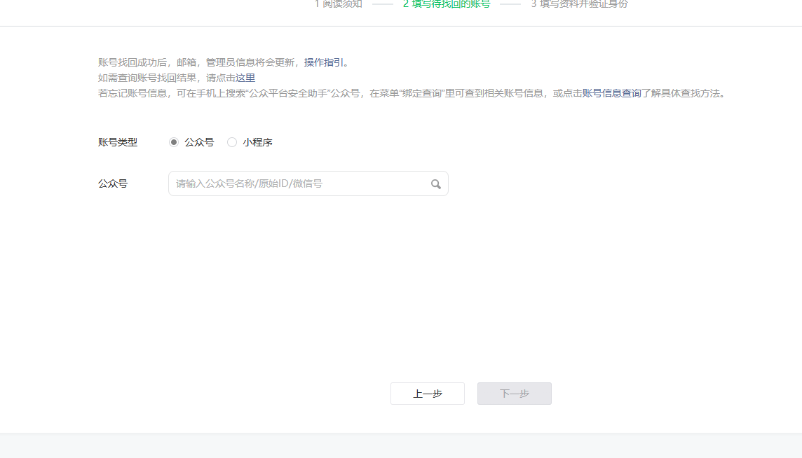 公司主体之前被人注册过公众号,现在公众号、名称、微信号都不知道,怎么样可以找过账号啊。再这一步卡主了,还到不了提交资料这一步。