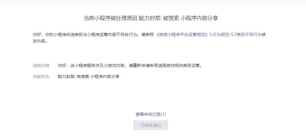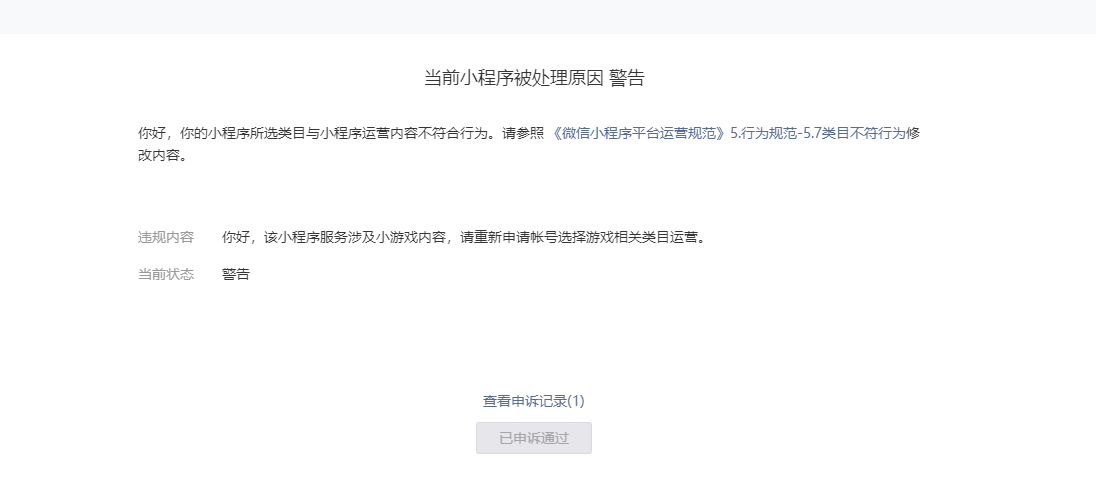 小程序被误判为小游戏,经过申诉说明已经通过了。
