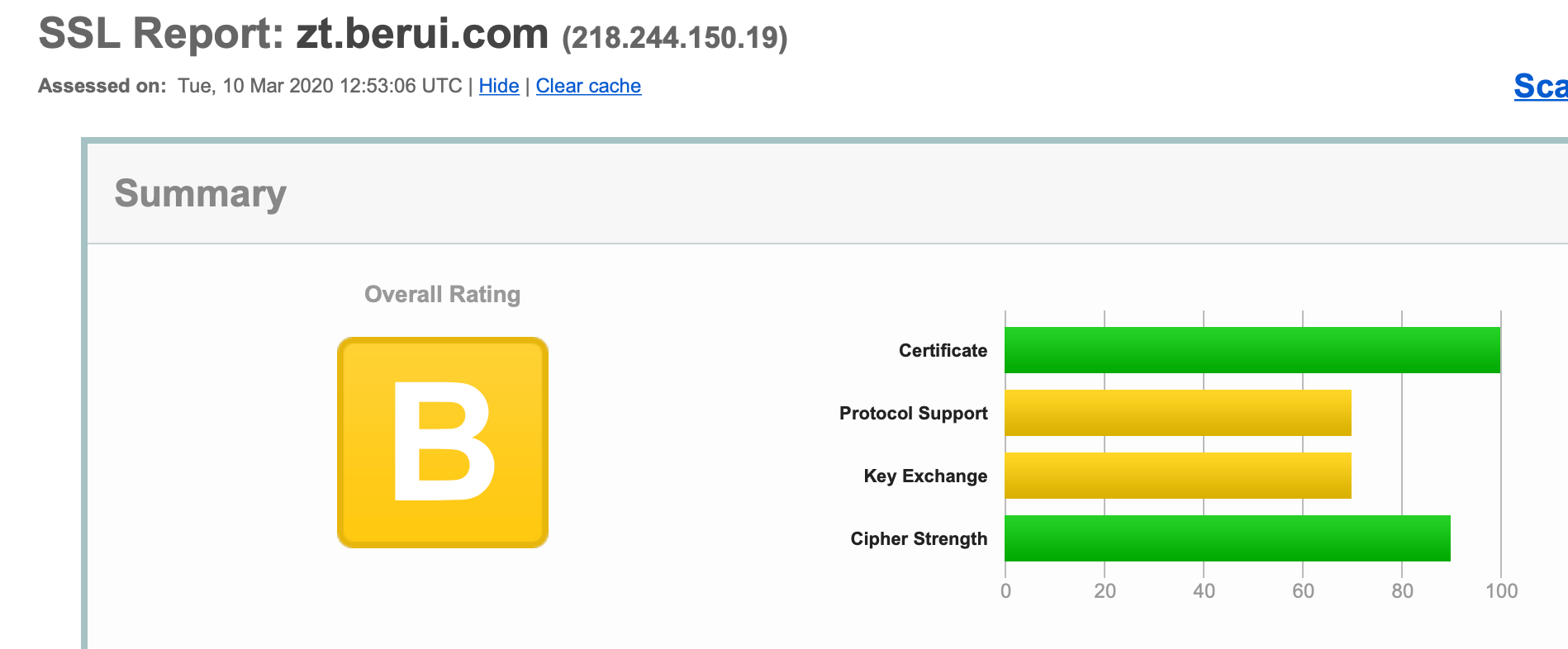 (2)可通过工具 https://www.ssllabs.com/ssltest/analyze.html 检查自己的服务器,对该工具标红的各项漏洞逐项修补,建议更新配置直到该工具打分为 C及以上 。