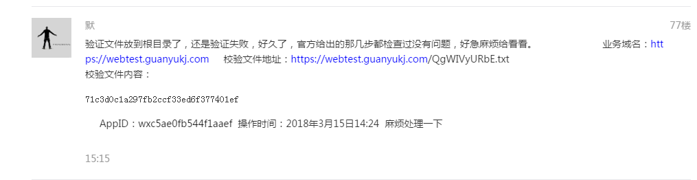 AppID:wxc5ae0fb544f1aaef 操作时间:2018年3月15日14:24 麻烦处理一下
