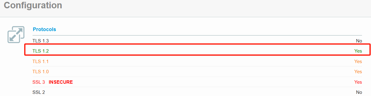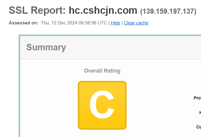(2)可通过工具 https://www.ssllabs.com/ssltest/analyze.html 检查自己的服务器,对该工具标红的各项漏洞逐项修补,建议更新配置直到该工具打分为 C及以上 。