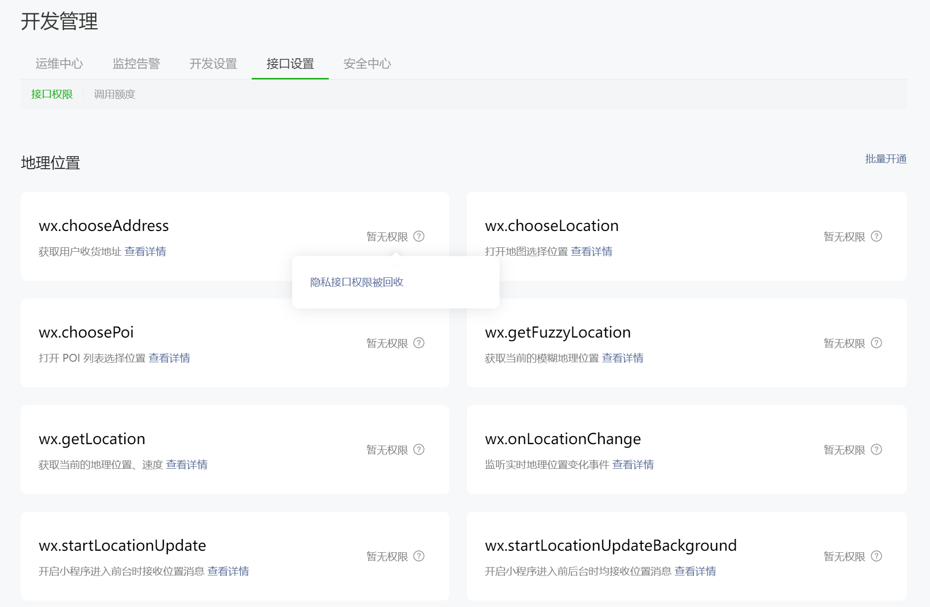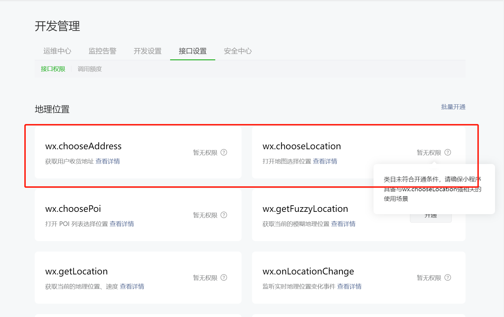 wx.chooseAddress、wx.getFuzzyLocation、wx.getLocation怎么提示无申请权限呢,小程序已经开了商家自营类目了,开通这个接口的要求到底是什么?