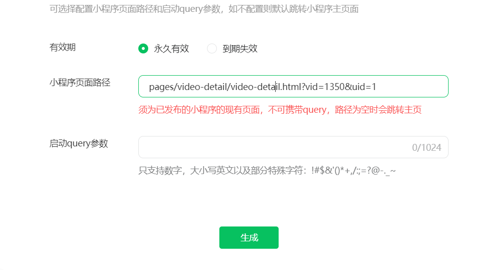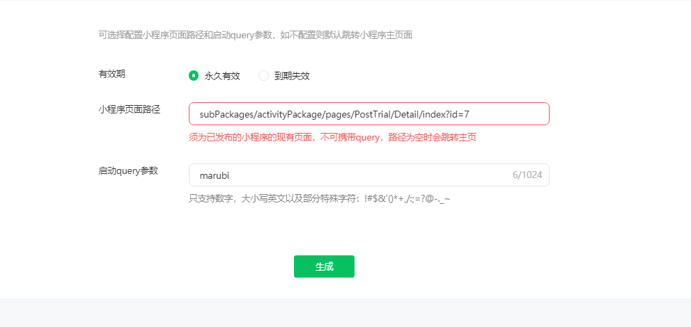 该页面确认为小程序页,但系统无法生成URL SCHEME,一直提示须为“已发布的小程序的现有页面,不可携带query,路径为空时会跳转主页”