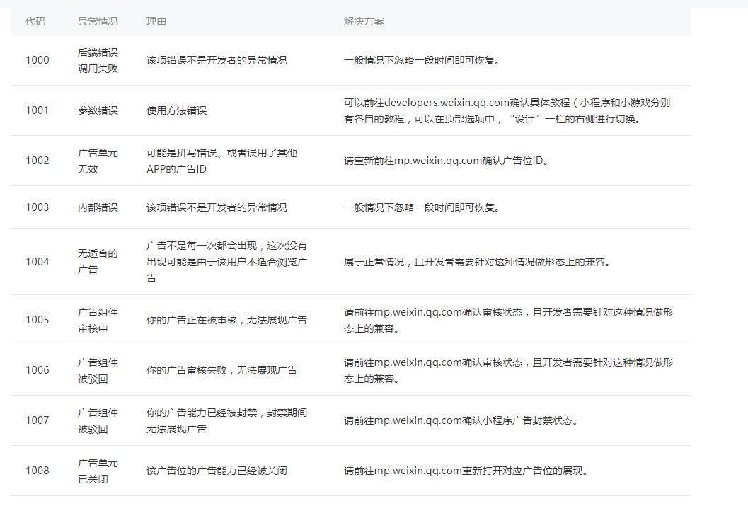 你好,广告异常情况说明,请参考:https://developers.weixin.qq.com/miniprogram/dev/component/ad.html