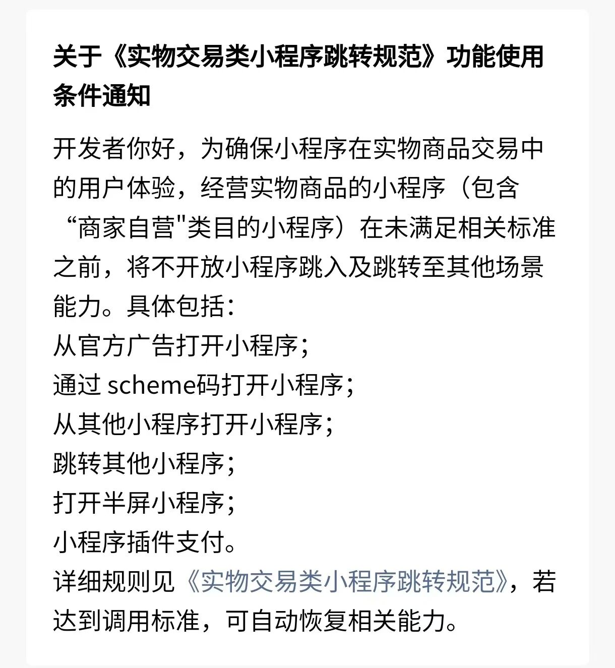 实物交易类小程序跳转规范请参考https://mp.weixin.qq.com/cgi-bin/announce?action=getannouncement&key=11736404407Ko3H2&version=1&lang=zh_CN&platform=2
