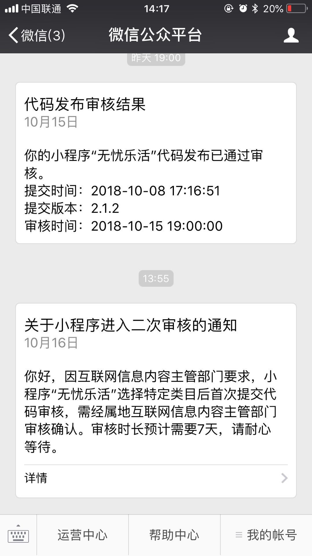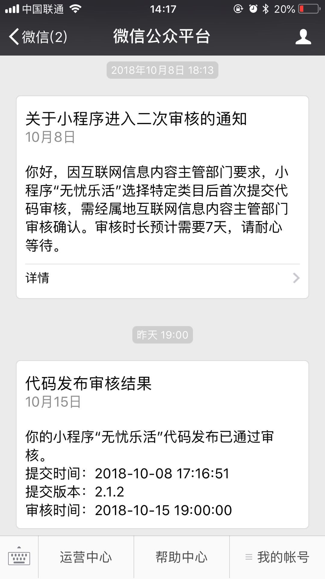 我在10月8日发布2.1.2的版本的时候,提示需要二次审核,于15日审核通过,发布预上线。因为时过7天,期间我修复了一些BUG,再2.1.2的版本审核通过之后提审2.1.7。