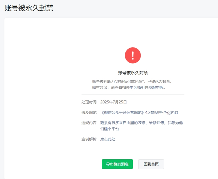 但文章内容,原创。介绍做公众号的起因,没有任何涉及身体、或其它的描述,是很正式的介绍,也完全能够被未成年人阅读。平台判定违规,感觉很不可思议……请求工作人员重新核查,给予解封。非常感谢!
