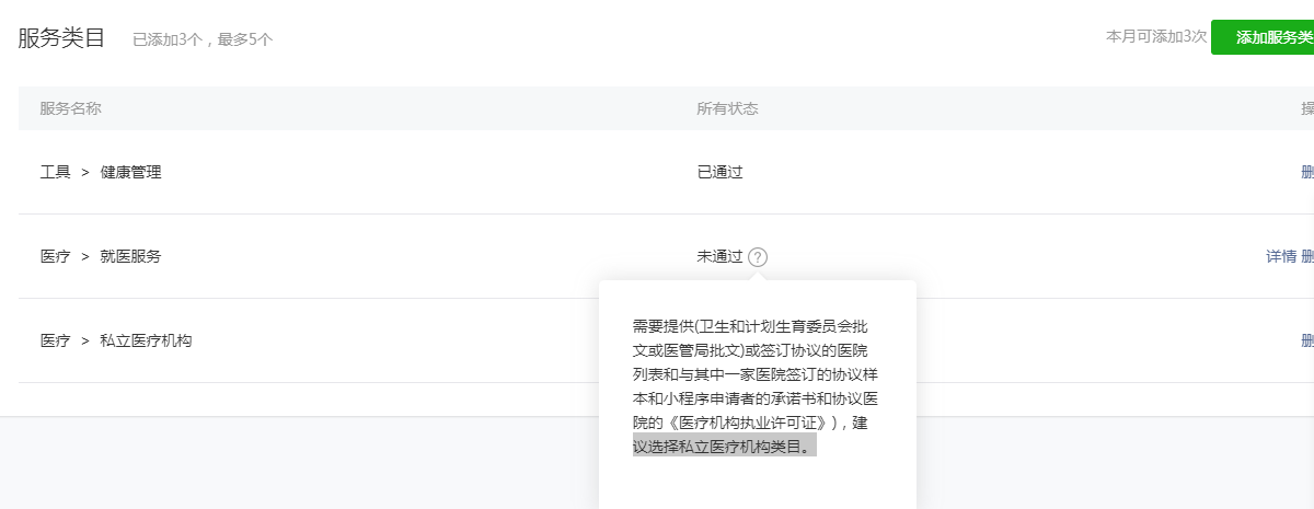 你好,用户已含”医疗-私立医疗机构“类目,若仅为单家提供的就医、健康咨询/问诊、医疗保健信息等服务,可不需选“就医服务”类目;涉类目资质及适用范围详情参考https://developers.weixin.qq.com/miniprogram/product/material/