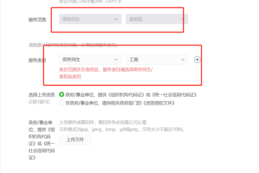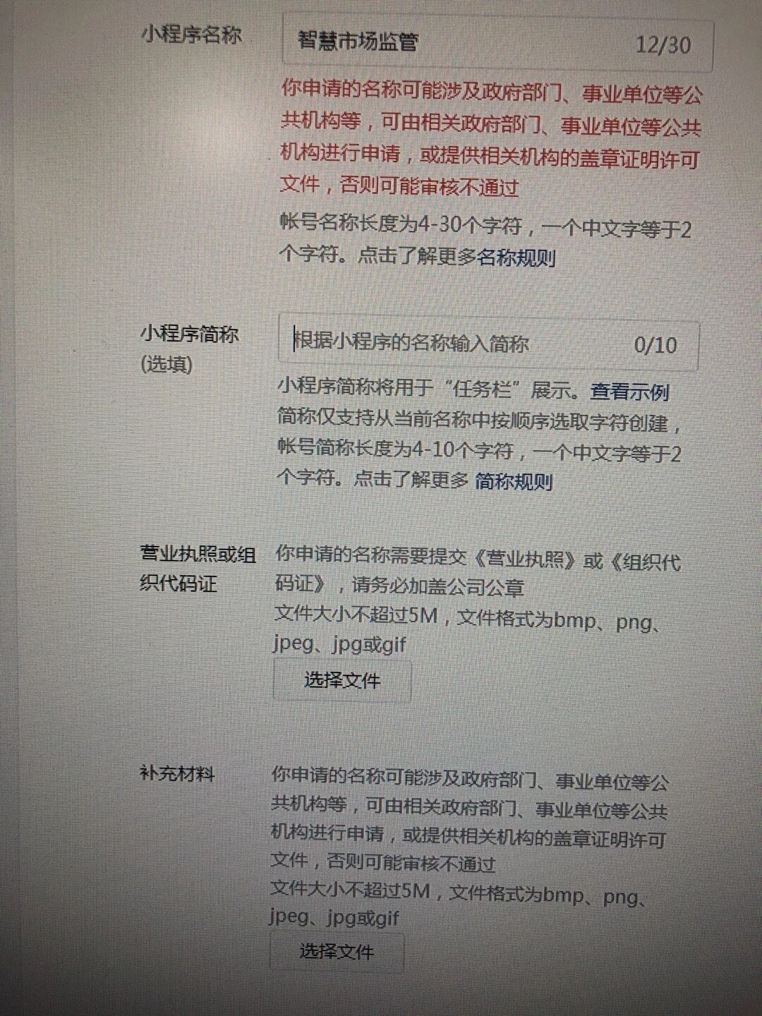 已经经过政府资质认证的小程序,补充小程序信息时候,因为小程序名称涉及政府部门,需要提交什么资质,如图,营业执照或组织机构代码指的申请人所在公司的资质吗