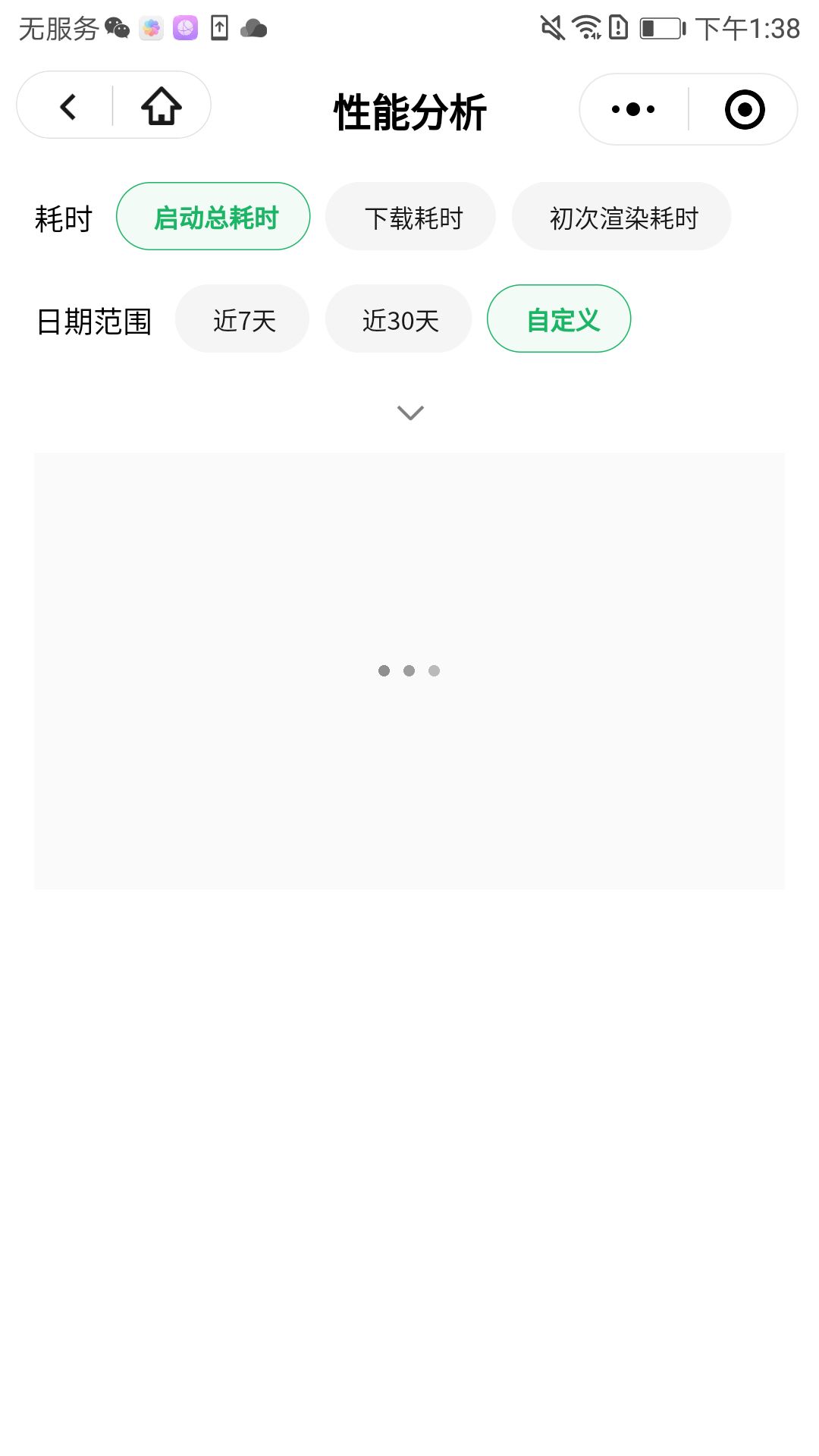 此处以官方小程序为例。使用华为荣耀9手机搜索“小程序助手",进入小程序后,找到数据分析栏目,进入栏目下性能分析页面。在性能分析页面中,多次(一般在5次左右)切换绘图数据范围,小程序将卡死。为简单起见,可以通过多次更改数据日期范围,bug将出现。bug出现时,如下图,图表一直都没画出来