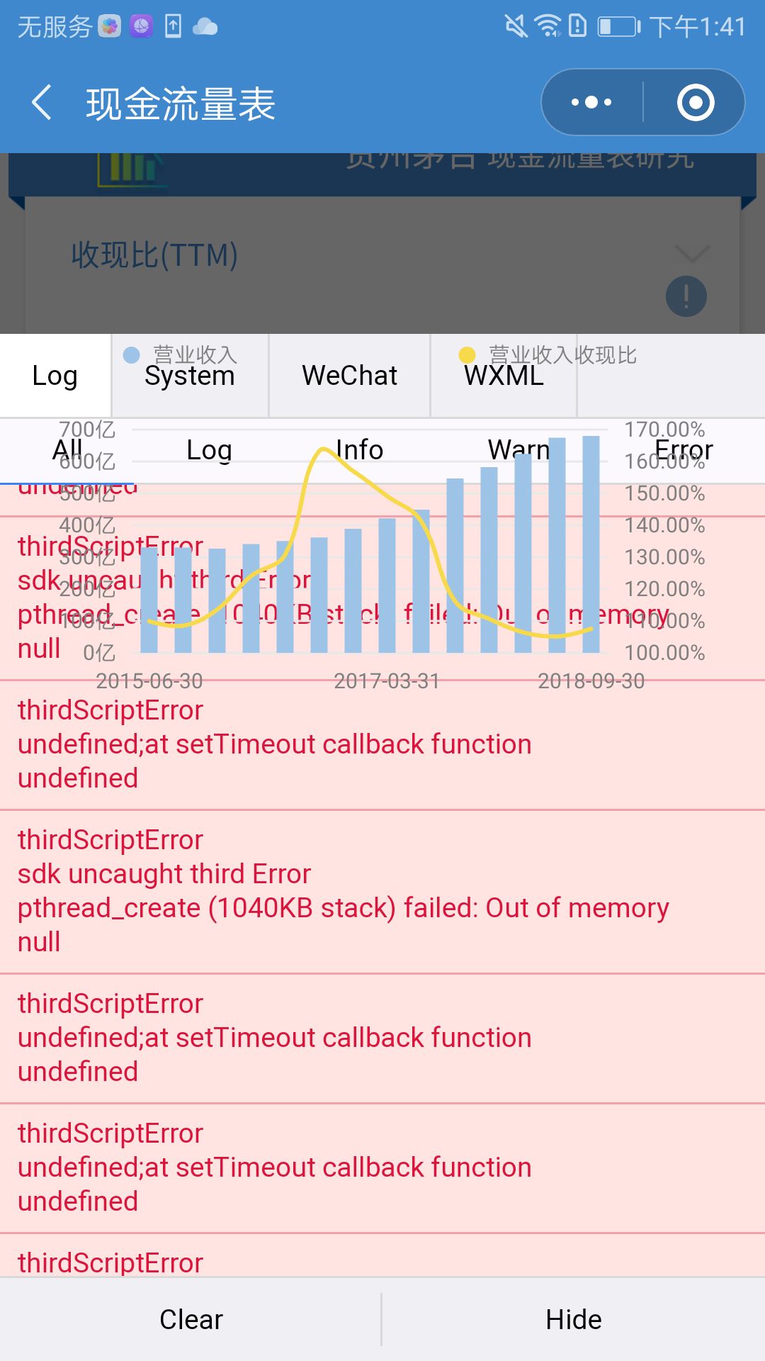 另外,在自主开发的小程序(使用wx-f2库绘图)中,打开调试,可以控制台中看到以下报错信息,