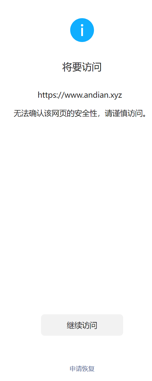 您好,域名(https://www.andian.xyz),本地生活多商家平台,域名在华为云云注册并备案通过浏览器访问正常,我是网站开发者,访问时间如图2025/07/02,微信访问网站出现“无法确认该网页的安全性,请谨慎访问”,经检查网页里没有不安全的内容,请核实后帮忙解除拦截,谢谢!