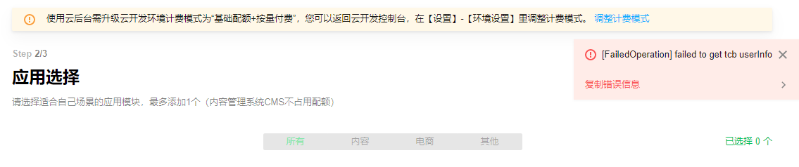 每次进来的时候报这个错,是因为我没有把云开发环境的计费模式换成“基础配额+按量付费”吗?这个提示不太友好,而且内测阶段不能多给一些人来体验吗,为啥我不充钱还不能尝试了