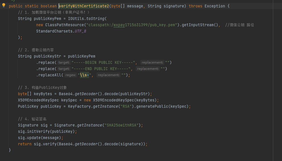 boolean flag = WechatPayUtils.verifyWithCertificate2(signStr.getBytes("utf-8"), signature);