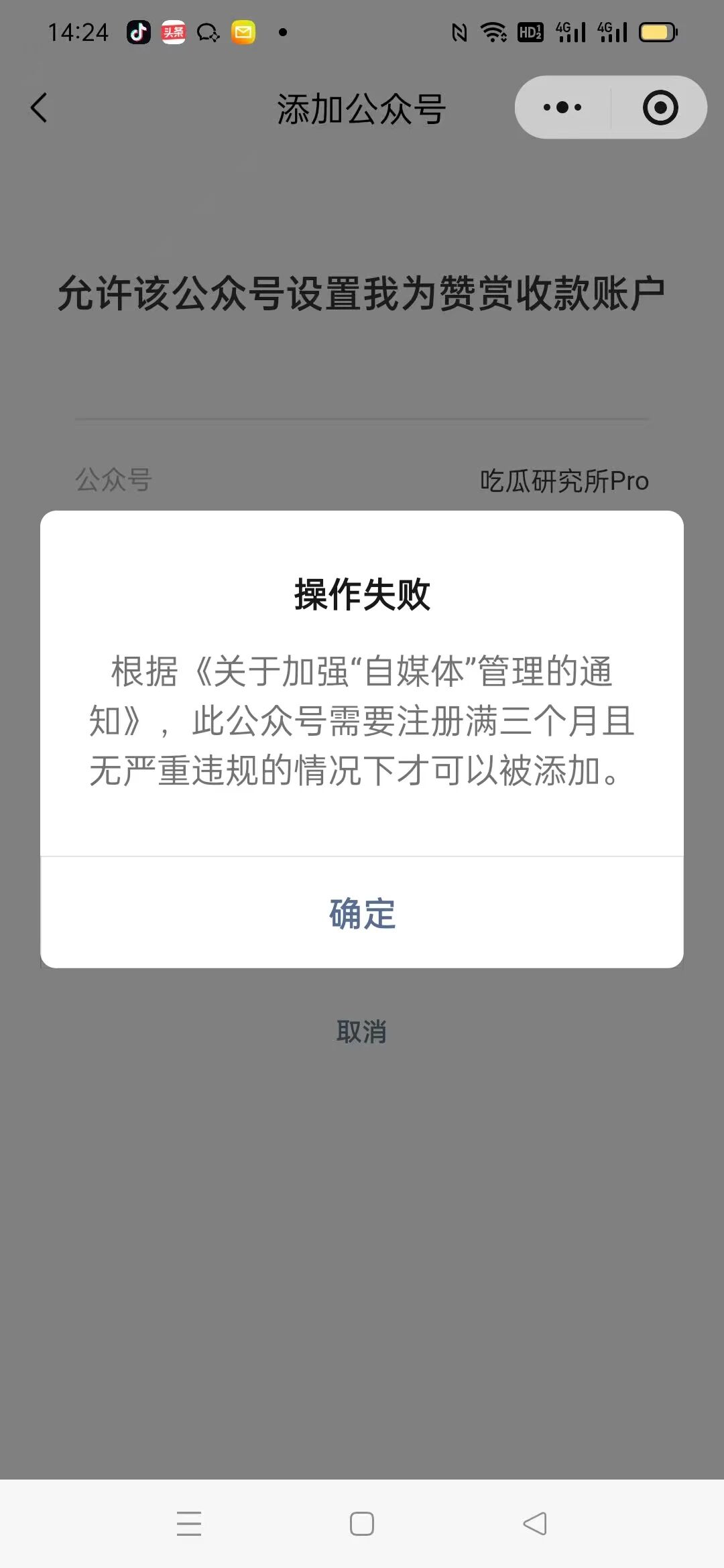 你好,这边核实到该账号是2025-12-14注册的,需要满三个月后才可添加赞赏账户