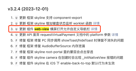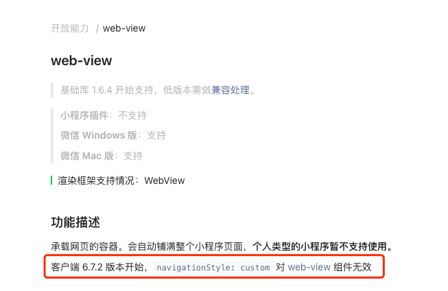 目前 web-view 组件只有在横屏下打开才允许自定义导航栏(基础库3.2.4开始),竖屏打开暂不支持自定义导航栏。